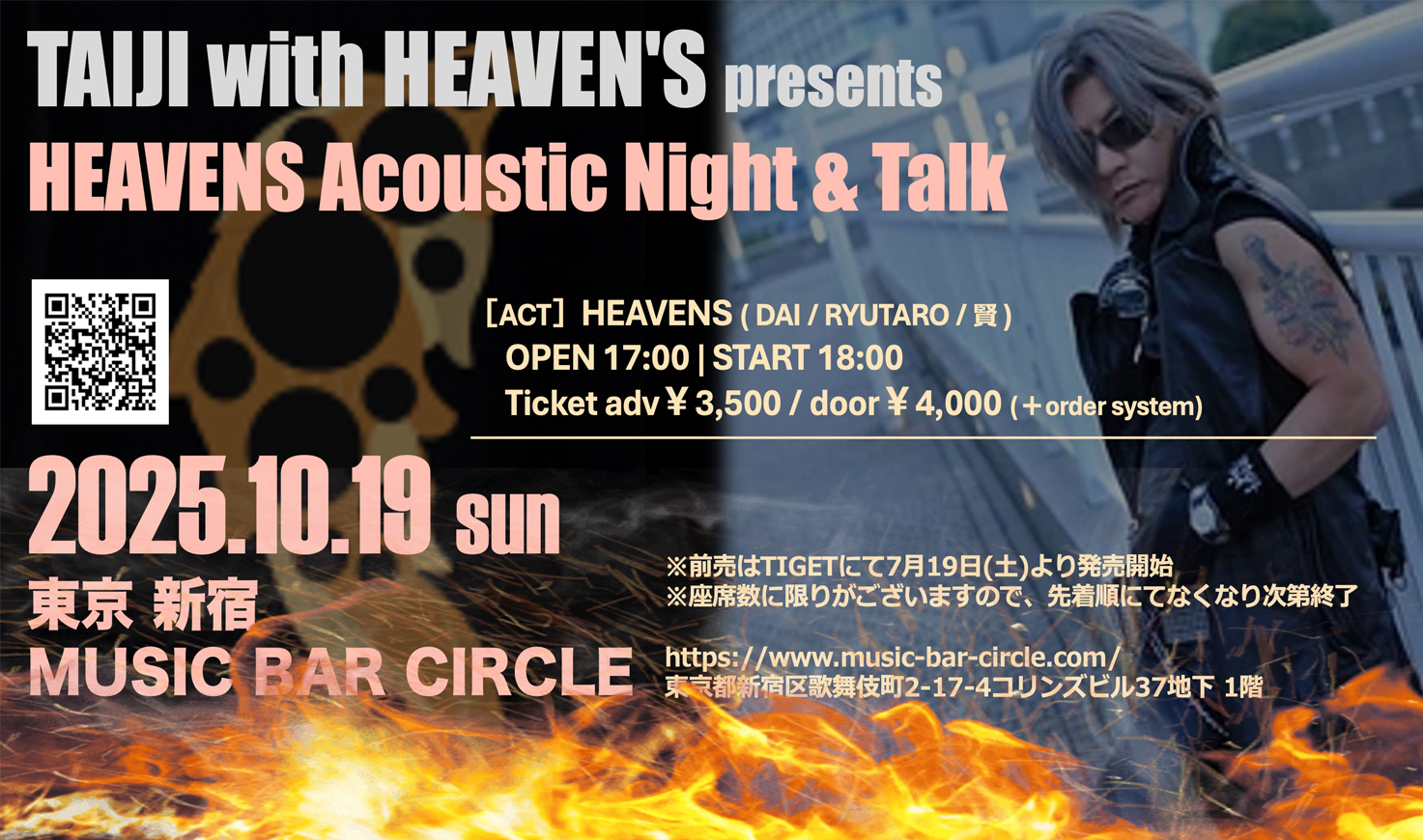 What‘s New 2025.10.19 sun TAIJI with HEAVENS PRESENTS HEAVENS Acoustic Night&Talk a t 東京新宿 MUSIC BAR CIRCLE SOLD OUT DAI 賢 RYUTARO